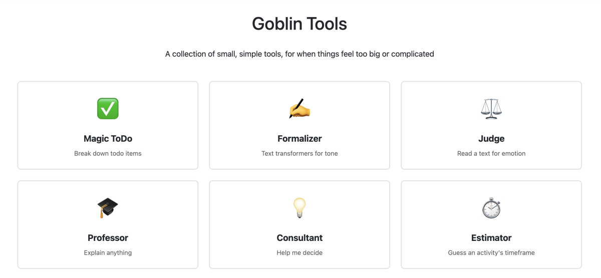 Goblin Tools is a free, AI-powered web application designed to help with task management, organisation, and communication, particularly for neurodivergent individuals. It offers several tools to break down large tasks, assess the tone of messages, compile information, and more. The website is free, and mobile apps are available for a small fee, with the app fees helping to keep the website free.