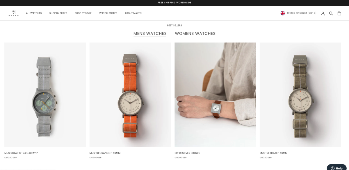 Shore Projects is inspired by the beauty and fun of the British seaside, and their watches reflect this playful aesthetic. The Shopify store captures this spirit with a bright, cheerful design and engaging product presentations. The site offers a unique “Build Your Own” feature, allowing customers to mix and match watch faces and straps to create a personalised timepiece. This interactive element, combined with high-quality images and easy navigation, makes the shopping experience delightful and memorable.