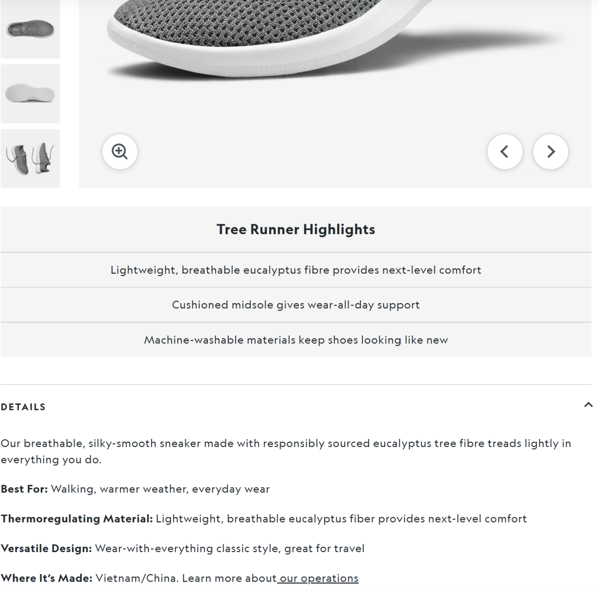Example: Allbirds excels in visual storytelling. Their product images showcase the shoes’ comfort, sustainability, and versatility.