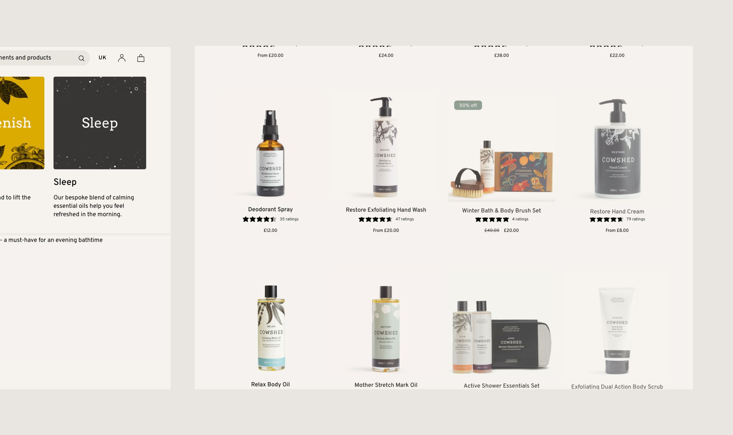 Radiant migrated Cowshed to a Shopify theme build with custom pages, redesigning elements of the site to improve the UX and usability.
