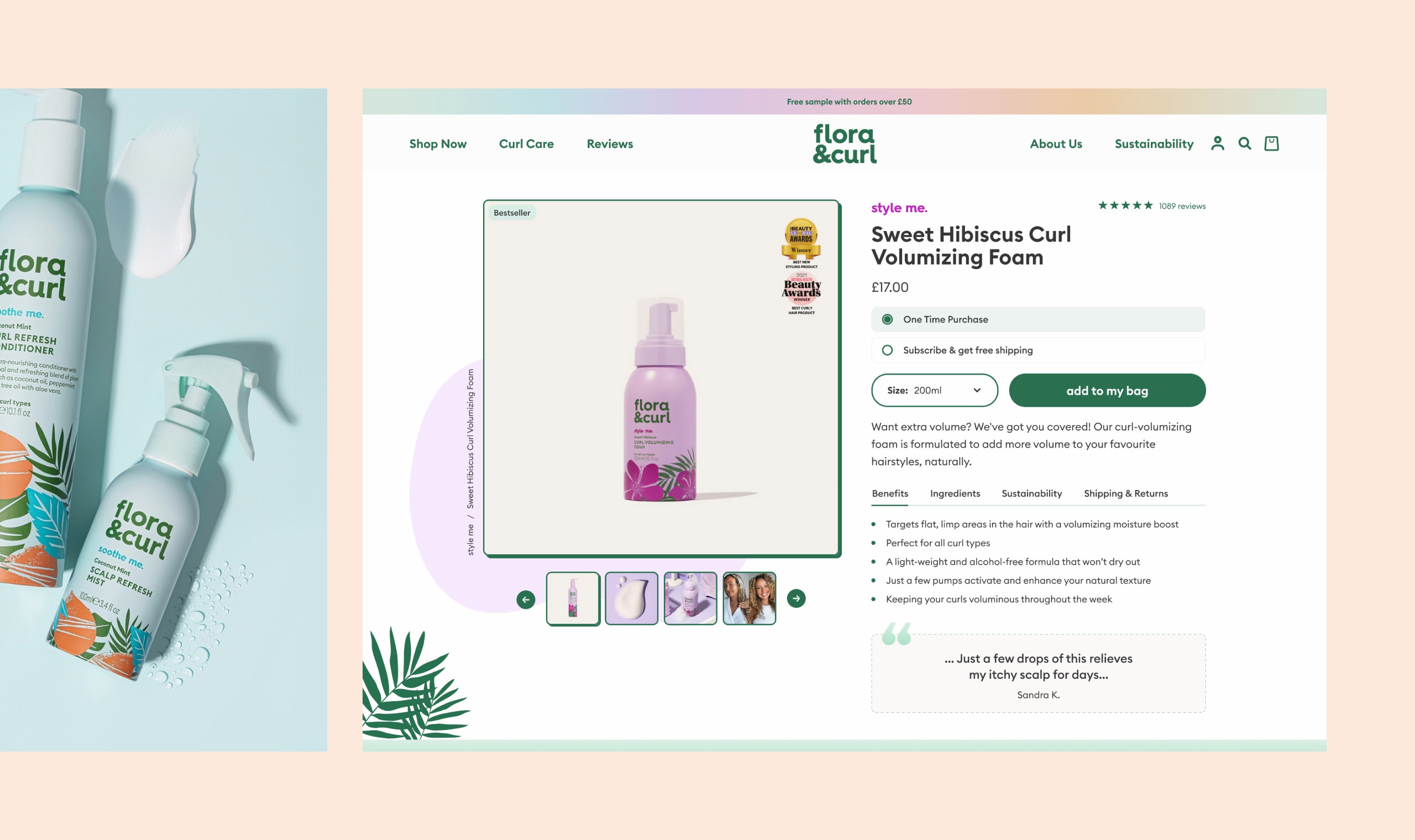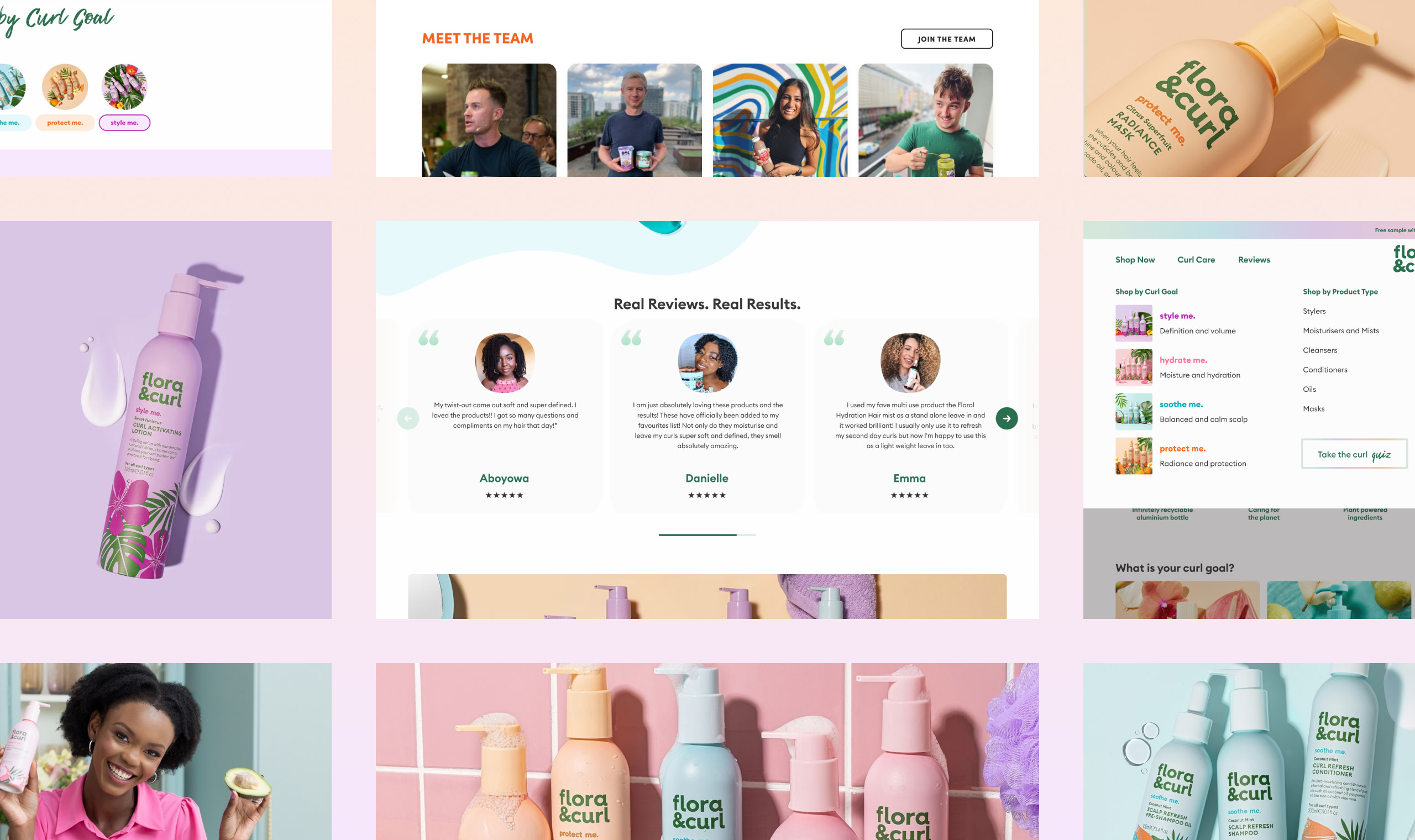 Drawing inspiration from Flora & Curl's new visual identity, we curated a design that felt fresh and fun while maintaining a user-friendly interface. The result? A visually stunning website that not only captivates visitors but also facilitates seamless navigation, allowing users to explore products effortlessly.