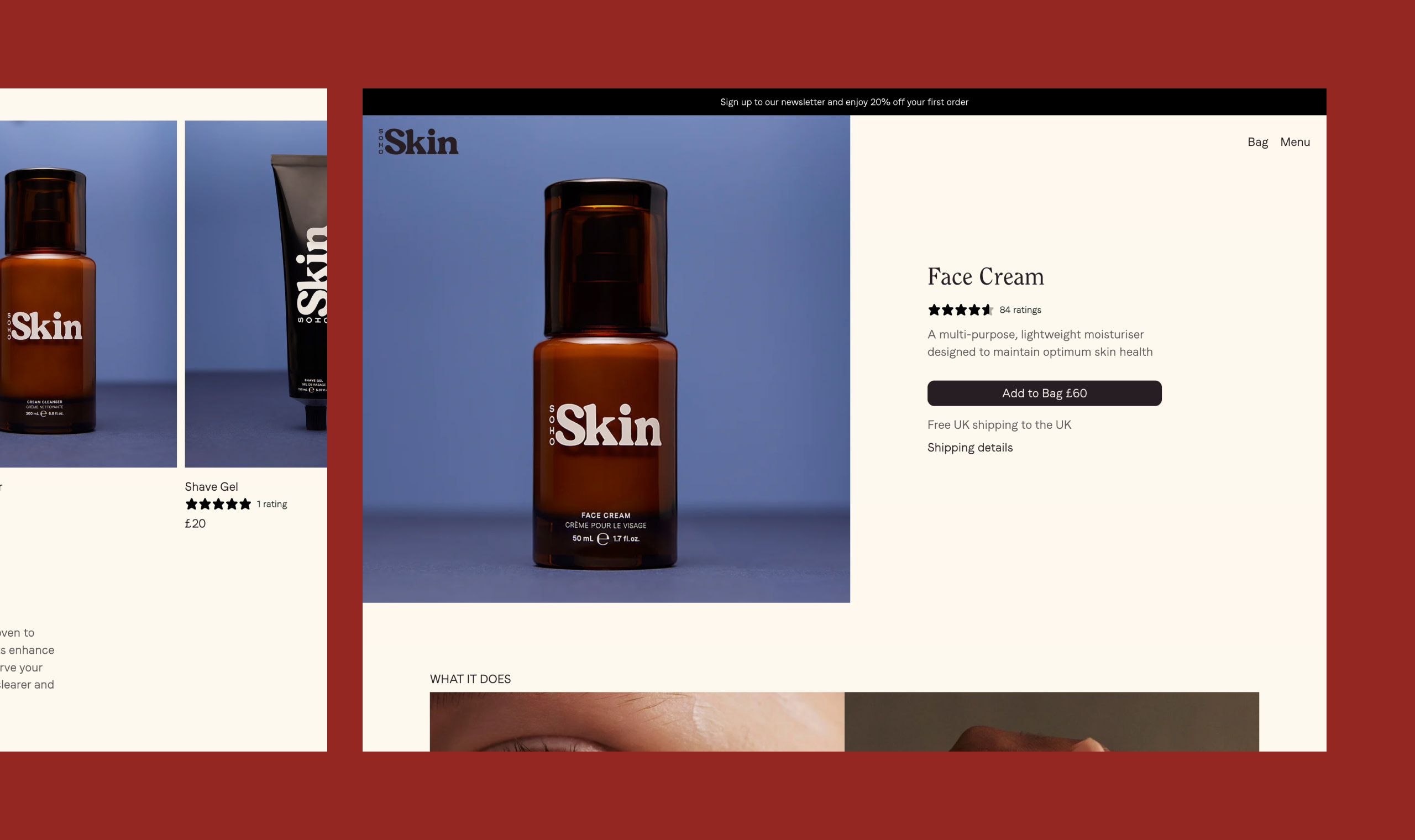 Talk To Us About Your ProjectWe designed and developed a custom-built site, and migrated Soho Skin to Shopify Plus on Shopify 2.0. The site conveys the luxury aesthetic and pricing of the brand and its products.